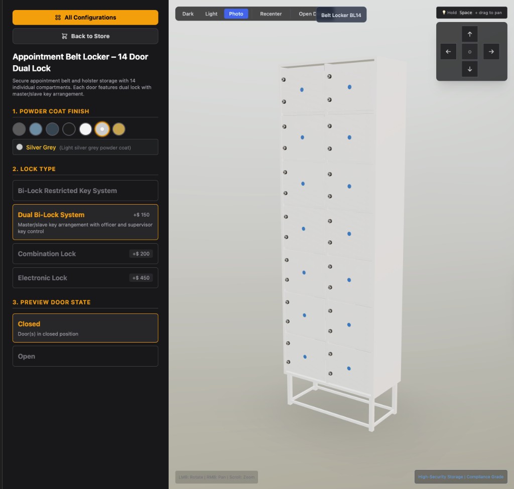 Secure appointment belt and holster storage with 14 individual compartments. Each door features dual lock with master/slave key arrangement.